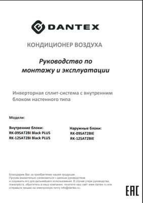 Документы и инструкция к кондиционеру DANTEX RK-09SAT2BI Black PLUS/RK-09SAT2BIE